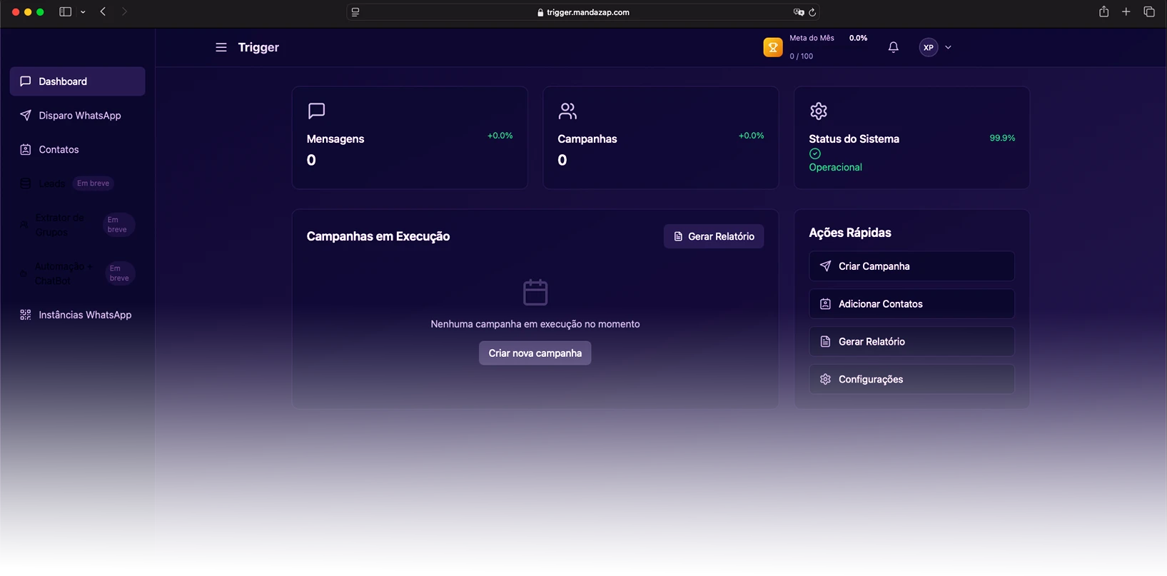 Interface moderna e fácil de usar, permitindo que você gerencie todas as funções do sistema de forma rápida e eficiente. Com um painel organizado, você acessa estatísticas, configura campanhas e acompanha seus disparos sem complicações.